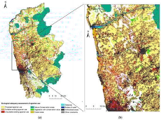 Afterwards, we readjust the resulting suitability map according to ecological constraints (Step 2; Figure 2) to safeguard critical components of the Ecological Network (i.e., green infrastructure; GI). According to Magalhães [61,67] the ecological network (EN) is recognized as a framework of ecological components providing the fundamental physical conditions for maintaining or restoring ecological functions and conserving and buffering core areas in terms of natural/semi-natural value while maintaining and establishing ecological connectivity. In this study, three EN components were included in the cartography as land use classes, namely: (1) coastal areas [68]; (2) nature conservation areas, matching the core areas for nature and biodiversity conservation, as the National System Classified Areas (NSCA; e.g., the “National Network of Protected Areas”—RNAP, Important Bird Areas—IBAs, “Natura 2000 Network—SCI and SPA”, “UNESCO Biosphere Reserve”, “Council of Europe Biogenetic Reserve”, and the “Ramsar Convention” on International Importance Wetlands) [57]; and (3) vegetation with conservation value, corresponding to the natural and semi-natural vegetation from moderate to very high conservation value [69]. Concerning the readjusting process, in coastal areas land with moderate and higher ecological suitability was considered suitable for maintaining agrarian use.