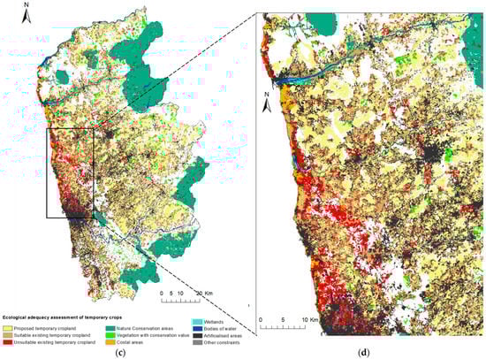 Ecological adequacy assessment (adequate or inadequate) of agrarian use concerning existing land use in 2018 (COS2018). The distinction between (a) general agrarian use and (c) specific agrarian use (temporary crops) with a detailed view located on the coast of the Porto Metropolitan Area and northern areas for both (b) general agrarian use and (d) temporary crops. The highlighted areas (in red) correspond to areas where existent agrarian use is classified as inadequate.