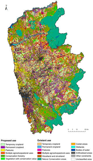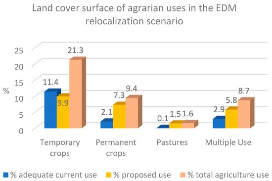 Finally, Figure 5 shows the result of the EDM potential foodshed relocalization scenario for the different agrarian usages, assigned accordingly to the ecological suitability criteria. In the relocalization scenario, existing temporary crops still represent the dominant land use with 21.3% (186,982.8 ha) of the EDM (Figure 6). These crops have the highest percentage of the proposed area corresponding to 9.9% (86,793.4 ha) of the EDM. Regardless of the notorious scarcity of ecologically suitable areas for permanent crops in the agrarian region, they undergo a significant increase of 7.3% (64,056.4 ha) of the proposed area, tripling their occupation to a total of 9.4% (82,400.3 ha), although distributed in a dispersed way, standing still very distant from the temporary crops. This might be explained by the permanent crops’ requirements in terms of soil depth (minimum of 50 cm) [65], limited by the biophysical characteristics of the study area; i.e., a total of 63% has soil depth values lower than 50 cm. Additionally, we should remark that the increased percentage of temporary and permanent crops matches the maximum values according to the agrarian use potential planning and the suitability methodology developed. Regarding multiple agrosilvopastoral uses, it is also possible to mark a significant expansion to 8.7% (76,068.6 ha) of the EDM, corresponding to the addition of 5.8% (50,530.7 ha) of the proposed area. Finally, pastures continue to be the least represented, despite observing a significant increase, from just 0.1% (1152.4 ha) of the adequate existent area to 1.6% (14,307.8 ha) of the whole territory.