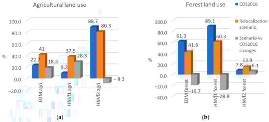 Quantitative analysis of land cover changes proposed by the relocalization scenario in the EDM and in the HNVf1 and HNVf2, concerning the 2018 cartography (COS2018) in (a) agricultural land use and (b) forest land use.