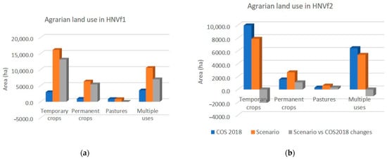 In the EDM relocalization scenario, the outcome revealed a general increase in agrarian use by 18.3% (+160,834.3 ha) when compared to the COS2018, as would be expected (Figure 7). This is essentially the result of the conversion of Eucalyptus and Pinus pinaster forests and scrubland with agricultural potential in the COS2018 (i.e., 26.1%, 14.6%, and 11.8%, respectively; Figure S2a). Moreover, HNVf1 and HNVf2 assessments depicted contrasting dynamics. In HNVf1 there is an increase of 28.3% (25,524.9 ha) in agrarian use, essentially of temporary crops (Figure 8), which mainly results from the conversion of scrubland areas with agrarian suitability (i.e., 59.5% of the proposed agrarian area; Figure S2a). Conversely, in HNVf2, the trend is reversed, with an overall decrease of 8.3% (1717.6 ha) in agrarian use, mainly represented by temporary crops. This followed, in turn, by an increase in “forest and other usages” (i.e., mainly the proposed class of conservation forestry; Figure S2b).