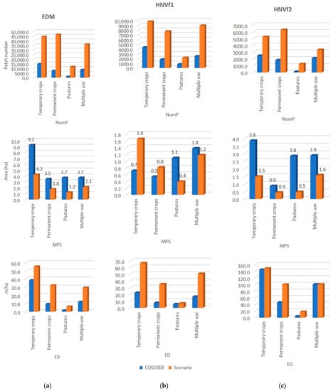 At the class level, the results of the scenario’s landscape structure analysis for agrarian land usage revealed the same tendency of increased patch number, reduction in the average size, and higher edge density (Figure 9). We noticed the apparent trend reversal of the declining patch size in HNVf1 concerning temporary and permanent crops. Regardless, we considered it negligible since patches continue to be small-sized (i.e., 1.6 ha and 0.8 ha, respectively). Although temporary crops equal the dominant agriculture land use in the EDM and HNVf1 and HNVf2, it is possible to observe a relatively increased number of patches representing permanent crops, which emerge more dispersed in the landscape in smaller size patches when compared to temporary crops. Multiple agrosilvopastoral uses also revealed high patch numbers, close to permanent crops, with decreased average size, although in HNVf2 they correspond to the larger patches. Finally, pastures are the least represented in the landscape, with few patch numbers, small sizes, and the lowest edge density.