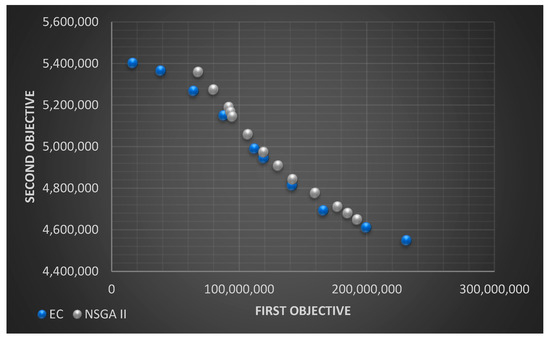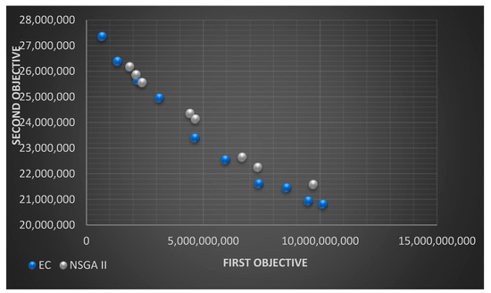 To validate the performance of NSGA-II, the results of the exact method are compared to the algorithm. All these 15 problem instances were solved using ε-constraint (EC), and each problem’s Pareto frontier was extracted. The EC method was implemented in GAMS software using a CPLEX solver with a 3600 s time limitation for implementation. Then, the results of the proposed NSGA-II were compared to the EC, and the performance of the algorithm was evaluated. In larger problems, the EC was not capable of solving the problems optimally in the proposed time limitation. The results of Problems 1 and 6 are displayed as a problem of small- and medium-sized Pareto frontiers. The metaheuristic was coded in MATLAB software and implemented on an operating system Intel® Core™ i7-2600 CPU @ 3.40 GHz, 4.00 GB and 64-bit. Figure 3 and Figure 4 represent the Pareto frontier of Problems 1 and 6, respectively. The figures show the conflict between the model objectives and the trade-off between them. In other words, they have an inverse relationship. The larger the first objective, the lower the second one.