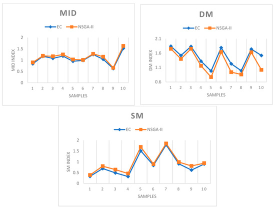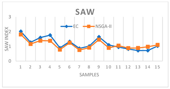 where n is the number of Pareto solutions (i = 1,2, …, n), and are the maximum and minimum value of objective i in all iterations, (,) is the coordination of the ideal point, is the Euclidean distance, and is the average of . Using Equations (21) to (24), the value of the metrics was calculated in each of the 15 problems and is presented in Table 5. In Figure 5, the values of the metrics for small- and medium-sized problems have been compared for both approaches. Accordingly, NSGA-II is rigorous in finding Pareto frontiers close to the optimal frontiers using the EC method. Moreover, for a general analysis of the NSGA-II performance, a comparison of the SAW measure has been presented in Figure 6. This figure also proves the closeness of the Pareto solutions using NSGA-II to the optimal Pareto solutions. As a result, the proposed NSGA-II can be reliable in solving large-sized problems that the EC is not able to solve optimally in the specific time limit.