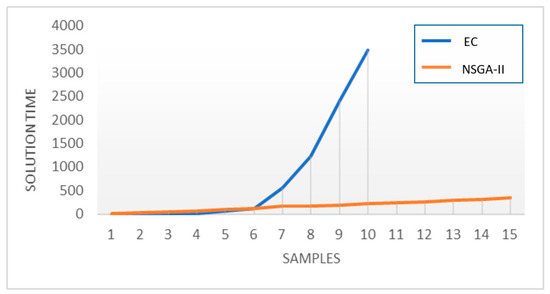 Notably, EC is better than NSGA-II in some cases because it is not capable of solving the problem optimally within the proposed time limit. For instance, in terms of the MID metric, the suggested NSGA-II algorithm shows a better performance than EC when the size of the problem increases. On such an occasion, the proposed NSGA-II can be highly helpful and reliable. Moreover, Table 6 and Figure 7 illustrate the computational time of the methods for each problem. Evidently, by increasing the problem size, the computational time of the EC method increases exponentially, until it cannot solve the large-sized problem in 3600 s. However, the proposed NSGA-II is capable of solving large-sized problems in a reasonable time.