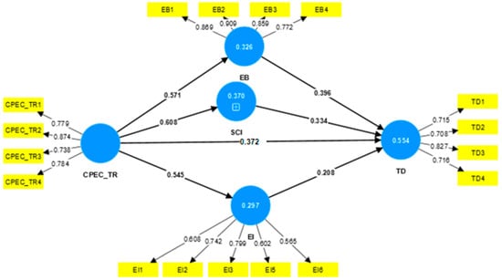 For examining the proposed hypotheses, a 5000-resample bootstrapping procedure was used in Smart-PLS. The results are presented in Table 5. According to the results, all hypotheses were supported. For all hypotheses, the Beta values (β) were attained more than 0.10, which means that they play a significant role in TD, both directly and indirectly. Similarly, the p-values and T-values for all of the relationships were achieved under its threshold, i.e., (p ≤ 0.05) and (T ≥ 1.96). The details are presented in Table 5, and the findings are also supported by the structural model, given in Figure 4.