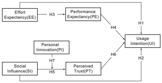 By strictly following the model structure of TRA, our study explores the effect mechanisms that influence users’ AR-HUD usage intention in terms of both cognitive factors (behavioral attitudes) and social factors (subjective norms), combining the content of the UTAUT to convert individual attitudes into performance expectancy and effort expectancy, and subjective norms into social influence. The study also refers to TAM, as well as to pertinent references in technology acceptance theories on perceived trust (PT) and personal innovation (PI), so as to identify a set of complex interrelationship factors driving usage intention in the hypothesized model: performance expectancy, effort expectancy, social influence, perceived trust, and personal innovation, through which these variables together construct a model of automotive users’ AR-HUD usage intention.
