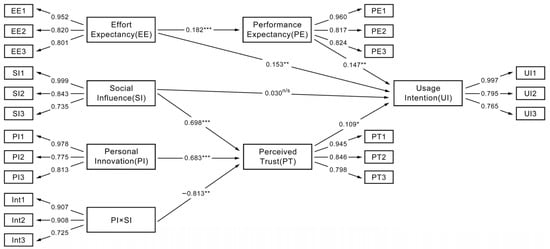We constructed a structural equation model (SEM) using AMOS 24.0 to test the hypothesized model framework and to explore the relationship between each variable and users’ AR-HUD usage intention. Firstly, the model fit was tested with CMIN/DF = 2.02, CMIN = 345.76, DF = 171, CFI = 0.977, TFI = 0.971, and RMSEA = 0.05, indicating that the model fit was good. The relationship between the variables is represented by the path coefficients, and the magnitude of the path coefficients can effectively represent the influence degree between different variables, with positive values indicating a positive correlation and negative values indicating a negative correlation. Table 4 presents the parameter estimation and hypothesis results of the users’ AR-HUD usage intention model. The results show that most of the hypotheses are validated, and the collected user data highly sustain our hypothetical model. Specifically, two perspectives—cognitive factors and social factors—are investigated in our proposed users’ AR-HUD usage intention model. On the one hand, it confirms that effort expectancy has a direct effect on users’ acceptance of AR-HUD (H1, β = 0.153, p = 0.004) and verifies the mediating role of performance expectancy (H3, β = 0.182, p < 0.001; H4, β= 0.147, p = 0.006). On the other hand, social influence indirectly affects users’ intention to use AR-HUD through the mediating role of perceived trust (H5, β = 0.698, p < 0.001; H6, β = 0.109, p = 0.041), and personal innovation serves as a moderating variable to regulate the strength of social influence on perceived trust (H7, β = −0.813, p = 0.004). Finally, H2 does not hold, and the path coefficient of H7 is in the opposite direction of the hypothesis. The results are shown in Table 4 and Figure 2.