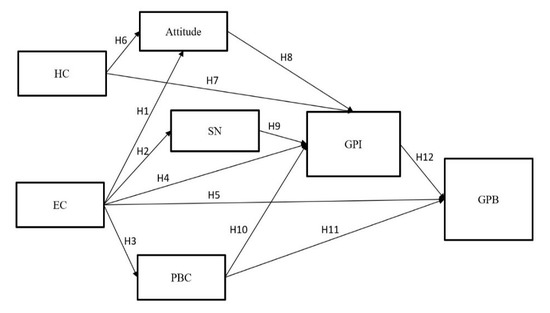Ajzen identified intention as the readiness of an individual to conduct a specific behaviour. Moreover, intention is believed to be an immediate precursor to behaviour and is therefore considered the best predictor of behaviour [63]. In other words, depending on the strength of an individuals’ intention to perform the behaviour, the intention turns into actual behaviour. According to Mostafa [64], GPB refers to buying eco-friendly and sustainable products that can be easily recycled and do not harm the environment and society. Consumers’ behaviour to purchase green products is assessed by GPI [65]. Other research indicated a strong relationship between buying intention towards green products and purchase behaviour [30,66,67], while such relationships are not well understood in other studies, such as Kumar et al. [68], Yadav and Pathak [23], and Wei et al., [69]. From the above discussion, the following hypothesis is proposed: