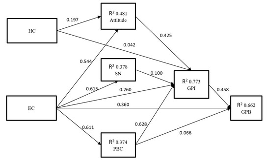 After the confirmation of the validity and reliability of the scales, the structural model was built, as discussed above in Table 3, Table 4 and Table 5. Regarding hypothesis testing, Table 6 shows the combined analysis of path coefficients, t-statistics, and p-values. The results shown in Table 6 indicate that EC -> attitude, EC is -> PBC, EC is -> GPI, EC is -> SN, attitude -> GPI, HC -> Att., HC -> GPI, PBC -> GPI, GPI -> GPB, and SN -> GPI have statistically significant path coefficients. The path coefficient PBC -> GPB was not statistically significant, as the t-value was lower than the recommended 1.96. Another hypothesis path coefficient, HC -> GPI, was statistically insignificant. Therefore, 10 hypotheses were accepted and 2 were rejected.