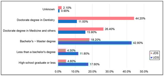 The majority of JDS had at least one parent with a doctorate or a professional degree. In contrast, only a quarter of UDS had at least one parent with a doctorate or a professional degree (Figure 1) [14]. There was a statistical difference between UDS and JDS on parents’ education level, with or without having a doctorate/professional degree (p < 0.01).