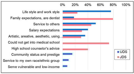 UDS value lifestyle and work style (Figure 2). In contrast, “family expectation and/or family member is a dentist” was the most influential reason for JDS. Service to others, salary expectations and work characteristics are, similarly, high-to-moderate reasons ranked for both UDS and JDS. JDS have two unique reasons, “Could not get into medical school” and “High school counselor’s advice”, that UDS did not indicate. UDS answered three reasons that JDS did not indicate, “Community status and prestige”, “Service to my own race/ethnic group” and ”Serve vulnerable and low-income” [14]. Lifestyle and work style were the top reason for UDS (76.4%), including the opportunity for self-employment and control of schedule [14]. JDS indicated family matters as the top reason (79.7%). “Could not get into medical school” was the second top reasons for JDS (73.4%).