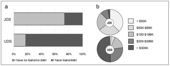 The loan/debt of graduating students. (a) The majority of JDS does not have loans/debt, while a large majority of UDS has; (b) The amount of loan/ debt of UDS is much higher than JDS.
