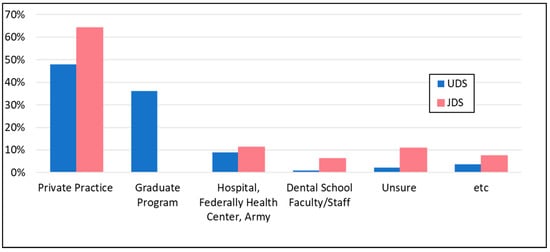 In Japan, the largest contingent of respondents chose to enter private practice (64.2%). Likewise, most UDS also chose “Private practice dentist” (48.0%), with the next most popular choice being “Graduate Program”, which includes being a dental graduate student, resident, or intern (36.2%) [14]. Among the students in the US who will enter private practice, 42.7% said they will be “Employed as associate”, 5.5% “Purchase existing private practice as sole proprietor”, and only 4.5% will “Establish a new private practice” [14]. No JDS stated a post-graduate program as an immediate plan because a general practice post-graduate residency is mandatory in Japan, and no specialty program system exists in Japan (Figure 4).
