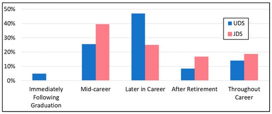 Both UDS and JDS indicated interest in teaching in dental school; 52.0% of UDS and 62.5% of JDS [14]. However, the majority of respondents who indicated “interest in teaching in dental school” answered that they would like to start teaching mid-career and late-career, even after retirement. Only 25.5% of UDS answered that they would like to start teaching mid-career, and 39.5% of JDS [14]. A total of 47.3% of UDS indicated that they would like to start teaching later in their careers, and 25.4% of JDS [14]. The percentage of respondents who answered that they would like to teach throughout their career was less than 20% for both UDS and JDS (Figure 5).