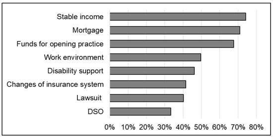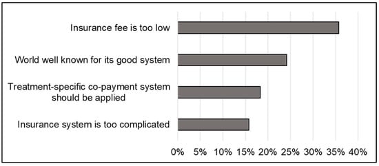 The top 3 concerns are related to financial issues (Figure 6). More than 75% of JDS had concerns on stable income, and approximately 70% of JDS had concerns on mortgages and funds for opening practices. More than 30% of JDS also indicated concerns on insurance changes and DSOs. JDS recognized that the Japanese universal healthcare system is a great system (24.1%); however, they claimed that insurance fees are too low (35.7%) and the system is too complicated (15.8%) (Figure 7).