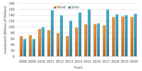 The investment for power generation from two major RESs, solar and wind, is depicted in Figure 1. It is observed that more money was invested in wind power generation in 2008 and 2009. The highest investments in wind generation were observed in the 2015 and 2017 with 160 billion USD. However, this scenario was reversed afterwards as solar power generation observed more investments [6,7,8]. However, clean energy generation is still very much low compared to the total energy demand. Over the last three decades, the global overall growth rate was around 126.5%, while electricity generation increased from 11.88 trillion to 26.91 trillion kilowatt-hours (kWh) [9]. This huge demand was mostly (two-thirds) met by fossil fuel-based generation, emitting huge amounts of GHGs, whereas less than one-third of energy generation was from RESs [10,11]. Thus, focusing on strategies for more RES electricity generation instead of fossil fuels is an important GHG emissions mitigation approach. However, the massive integration of RESs with the utility grids is challenging and needs comprehensive technical and feasibility studies [12,13,14].