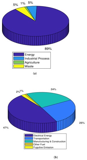 The GHG emissions of the KSA have been discussed in the national communication reports submitted by the presidency of the meteorology and environment (PME) to the United Nations Framework Convention on Climate Change (UNFCCC) for 1990 [40], and 2000 [41]. The level of carbon dioxide (CO) emissions in 2000 was estimated at 284.36 Mega tons, with the industrial sector contributing 7.4%, and the energy sector contributing 92.1%. The dominant CO-emitting energy sectors were electrical power generation, transportation, desalination projects, and the petroleum-refining sector with the emission leveld of 33%, 21%, 11%, and 8%, respectively. Out of the total 1.449 Mega tons of methane (CH) emissions, the waste sector contributed 66%, the energy sector contributed 26.3%, and the agriculture sector contributed 6.8%. The total nitrous oxide (NO) emission by the KSA was recorded at 0.03802 Mega tons. The two dominating NO-emitting sectors were agriculture and waste, which contributed 88.6% and 7.6% emissions, respectively. Several studies have shown that the most contributing sector in GHG emissions is the energy sector with almost 89% of the total emissions [42], as shown in Figure 4a. The emissions from the energy sector is further sub-categorized into different categories, such as electrical power generation, transportation, and construction and manufacturing, contributing around 47, 26, and 24, respectively, as shown in Figure 4b.