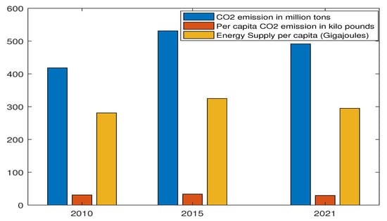 In [23,24,25,26,27], the impacts of electricity generation on GHG emissions for various countries are discussed broadly. However, few technical or review articles were found focusing on the impact of electricity generation on GHG emissions [28,29,30]. The environmental Kuznets curve (EKC) hypothesis was proposed to assess the dynamic impact of CO emissions due to sector value addition and economic growth considering energy efficiency measures [28]. The short and long-term CO emissions reduction strategies were also suggested by providing an industrialization planning policy.