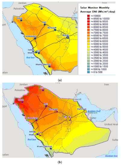 Direct normal irradiance of the KSA in (a) January and (b) July [37].