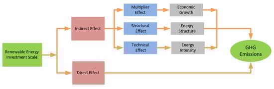 Investments in renewable energy have the potential to significantly cut carbon dioxide emissions and advance the transformation of the energy system to one that is low-carbon, effectively lowering the energy intensity [107,108]. The “multiplier effect,” “structural effect,” and “technique effect” mechanisms can be used to categorize the impact of the scale of investments in renewable energy on carbon dioxide emissions [109,110], as shown in Figure 8. According to the “multiplier effect” mechanism, the amount invested in renewable energy has an impact on carbon dioxide emissions through changes in the economy. Similarly, increasing the renewable energy investment scale can reduce GHG emissions through the structural and technical effects. Using the annual data from 1981 to 2015, the authors of [111] investigated the relationship between agricultural value added, coal electricity, hydroelectricity, renewable energy, forest area, vegetable area, and GHG emissions in Pakistan. Two techniques investigated the causal relationships among all the explanatory factors and GHG emissions, added agricultural value, coal electricity, hydroelectricity, renewable energy, and forest area. In [112], the causative relationship between GHG emissions, power generation, and consumption for 10 Middle Eastern and North African (MENA) nations between 1980 and 2009 was investigated. Real gross domestic product (GDP) per capita exhibited an inverted U-shaped relationship with CO emissions, according to the panel’s fully modified ordinary least squares (FMOLS) and dynamic ordinary least squares (DOLS) results. In general, reducing GHG emissions had a number of co-benefits, such as improving energy security and lowering local air pollution. The long-range energy alternative planning (LEAP) model was used in [113] to estimate the potential GHG emission reduction in Thailand from the use of renewable energy sources and increasing energy efficiency during 2015–2050. Results showed how Thailand may contribute to its nationally determined contribution (NDC) through domestic renewable energy sources and energy efficiency measures. In a nutshell, many countries have accomplished different analyses and adjust their energy policies to reduce GHG emissions. Similarly, the KSA has undertaken several initiatives in the energy sector to actively contribute to the UNFCCC and Paris Agreement goals.