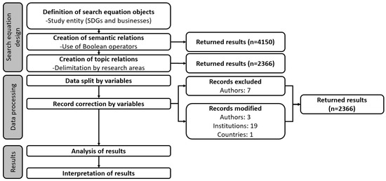Analyzing the algorithm, it can be seen that the search was divided into two main groups: SDGs and companies. To avoid possible omissions, several terms were used, which were also checked one by one in the Thesaurus web dictionary of synonyms and antonyms to corroborate that all terms likely to provide results of interest had been considered. In addition, the NEAR operator with a value of 5 was used, which limited the valid papers to those that presented results from both groups separated by five or fewer words [38], thus avoiding unrelated topics that could casually present such terms. At the same time, the so-called wildcard (*) was used to include possible variations of words in the valid results [39]. Finally, it should be mentioned that, within the groups, the Boolean operator OR was used when dealing with synonyms. These parameters were applied to the topic, which includes the title and the abstract of the papers, as well as the keywords provided by the author and those included by WOS itself until 2022.