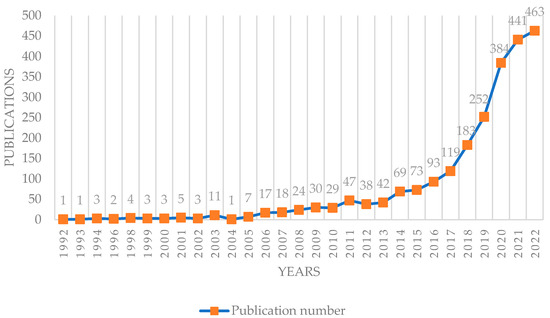 However, although the SDGs were formulated in 2015 by the United Nations, the historical series on the scientific production analyzed begins in 1992, as can be seen in Figure 2. This is because in 1992, at the United Nations Conference on Environment and Development in Rio de Janeiro, the idea of developing an agenda, Agenda 21, which would address urgent problems and prepare the world for the 21st century, had already been discussed, as it had been recognized that humanity was facing a defining moment in its history [46]. Global challenges such as increasing inequalities between and within nations, worsening poverty, hunger, disease and the continuing deterioration of ecosystems on which human well-being depends required the attention of all nations [47]. The concern to integrate the environment and development into a prosperous future was embodied in Agenda 21, a document that for the first time reflected a political commitment and global consensus with a high level of cooperation for development and the environment. The agenda was organized into three sections: economic and social dimension, conservation and resource management for development and strengthening the role of major groups, totaling 31 programme areas, each with their respective objectives, activities and means of implementation [48].