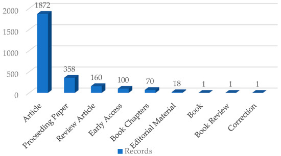 Regarding the distribution of scientific output by publication format used, as can be seen in Figure 3, journal articles are the main source of dissemination of research on the contribution of business to the SDGs, with 1872 results (accounting for 79.12% of the 2366 results returned by the search equation). Proceedings articles and article reviews also stand out, accounting for 358 (15.13%) and 160 (6.76%) of the records, respectively, demonstrating that the structure of the publication format does not differ from that of other research fields. The rest of the results are divided between early access articles, book chapters, editorial materials, books, book reviewers and corrections.