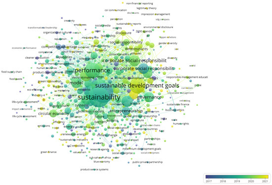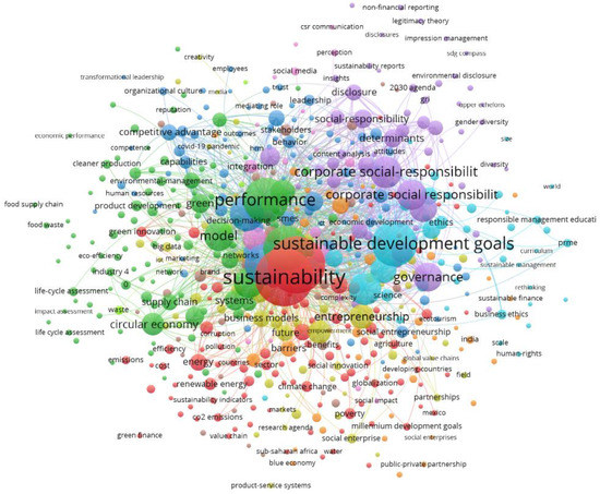 In order to graphically illustrate the connection between the study of the SDGs at the business level and other topics, a keyword co-occurrence analysis was carried out. In this way, it was possible to identify the relationships between keywords of the topic under study, based on the proximity within the map. As can be seen from Figure 4, there is a strong connection between the keywords sustainability and sustainable development, as these concepts are two ways of understanding the purpose of the SDGs. Furthermore, these keywords are linked, among others, with the words CSR and CS (representing complementary frameworks for achieving the SDGs), digital economy and digitalization (representing two means to enhance the achievement of the SDGs at the business level) or performance and competitive advantage (being two benefits that adherence to the SDGs by companies can provide).