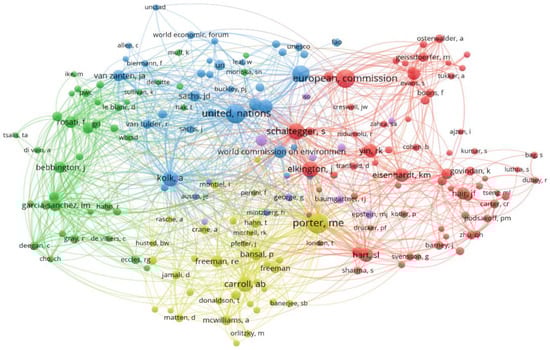 Although it is necessary to expose the content included in Table 4, the interest of the authors’ analysis remains in the co-citation relationships shown in Figure 6. The co-citation analysis developed allows us to discover the number of times two authors are co-cited by other scholars and, consequently, and is also used as a proxy to establish possible relationships in their lines of research. According to the number of co-citations, Michael Porter, Stefan Schaltegger, Archie Carroll, the United Nations and the European Commission appear as the most influential in the research area analyzed as they have the highest number of co-citations with the rest of the main authors, thus differing from the pattern shown in Table 4. This is due to the strong influence of the three authors and the two institutions in the field of SDGs and competitive advantage for organizations. Thus, the United Nations is the author of the founding texts of the SDGs and the Brundland Report in which the foundations of sustainability and sustainable development are laid [4,5]; the European Commission is the author of the main reports to achieve sustainability and sustainable development within the European Union SDGs [52,53,54]; Michael Porter is considered the father of business strategy given his research to investigate the achievement of business competitive advantages [54]; Stefan Schaltegger is the author of the main research on CS [55]; and Archie Carroll is one of the great scholars of CSR [56]. This makes the named authors and institutions particularly relevant to the topic under discussion, and they are therefore cited together when developing research on the subject, since their citation allows us to draw on the foundational texts of the SDGs, sustainability and sustainable development, while explaining their relevance for gaining competitive advantage, as well as their possible integration within CSR and CS programmes. Moreover, it should also be noted that the five authors share the importance of improving the competitive position of organizations through respect for profanity and respect for the environment in which companies operate, showing that the principles that govern sustainability can be a means of business differentiation, as well as a way to guarantee the sustainable competitive advantage of companies over time.
