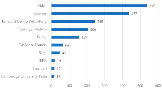With regards to the top journals for disseminating research results, Table 6 shows that Sustainability (504 publications) has the highest number of contributions, followed by Journal of Cleaner Production (217) and Business Strategy and the Environment (59). Of the top 30 journals, 25 have a Journal Impact Factor (JIF), a measure applied to those journals considered to have sufficient quality and research impact (Clarivate, 2021). Specifically, 14 belong to the 1st quartile in at least one of their categories, while 9 belong to the 2nd quartile, which means that they are in the top 25% and 50% of the journals previously considered to have sufficient quality and impact, being mostly journals specializing in environmental research and, to a lesser extent, in the study of business. With regard to the weight of the importance of publishers by academic publications, as can be seen in Figure 7, it is worth noting that MDPI occupies the first position, with 537 publications, followed by Elsevier (437), Emerald (245), Springer (206) and Wiley (157).