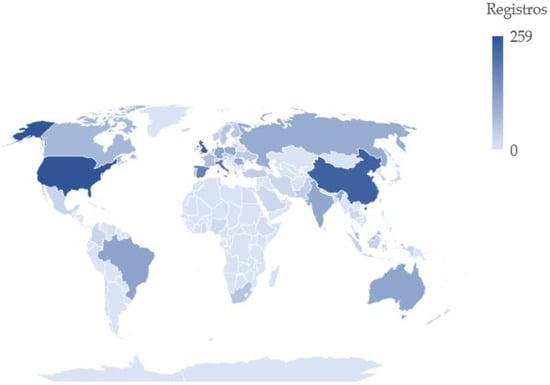 In terms of the geographical distribution of the scientific production analyzed, Figure 8 shows that the United States is the country with the greatest contribution in terms of works. A total of 259 publications are related to American institutions, followed by the United Kingdom with 247 and China with 236. In fact, these three countries account for 31.36% of all existing scientific production on the subject. The role of Italy (198), Spain (178) and Germany (119) also stands out, both in terms of scientific production, occupying fourth, fifth and sixth place, respectively, and in terms of the number of relevant authors and institutions focused on the subject under study.