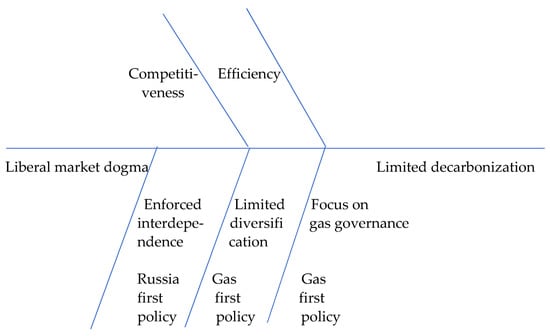 The Russian attack on Ukraine, however, rendered the continuation of business as usual impossible, and removed any pretenses that trade patterns could be maintained under these circumstances. Competitiveness and efficiency ceased to be the main game in town, as the trade patterns that ensured them also threatened the vital goals of security and resilience. Interdependence was no longer viewed as mutually beneficial, but as weaponized and impossible among rival geopolitical aspirations. Figure 1 below captures the root causes of insufficient decarbonization before the war in Ukraine and links up the dogma and principles guiding EU energy and climate policy with its effects on decarbonization.