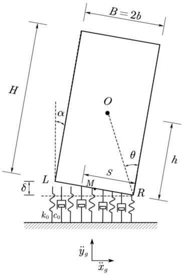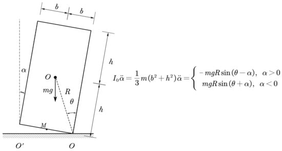 , denoting the moment of inertia of the rigid block to the bottom midpoint M. When the left end is raised, the motion equation is shown in Equation (19).