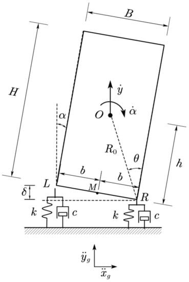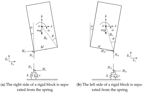Assume that the rigid block has only two degrees of freedom: vertical and rotation. It can rotate around points L and R, but once it contacts the left or right spring supports, the contact point will only allow vertical movement. When the displacement is small, the rigid block is in continuous contact with the two supports L and R throughout the movement. If the mass of the rigid block is , when the vertical lifting of its side exceeds the displacement of the support spring due to the dead weight of the rigid block , separation occurs and the block is supported only on the other side. Therefore, a rigid block has four motion states: