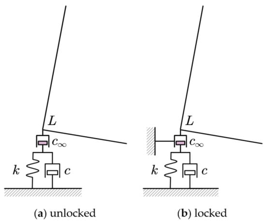 . Because of its large damping coefficient, the damper is essentially equivalent to a rigid link, which does not affect the response of the system, except in the case of collision. At the moment of impact, we assume that the rigid damper is locked, as shown in