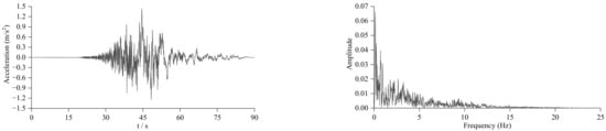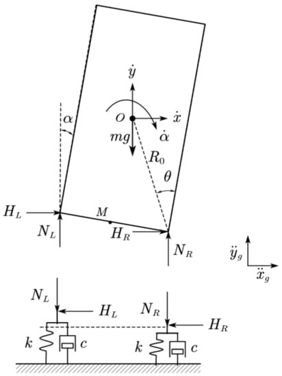and are the horizontal and vertical accelerations of the center of the rigid block, respectively; and are the vertical reactions of the left and right bearings, respectively; and are the horizontal reaction force of the left and right supports, respectively; and are the time history of horizontal component and vertical component of ground acceleration, respectively; is the acceleration of gravity; and the other characters have the same meanings as above.
