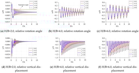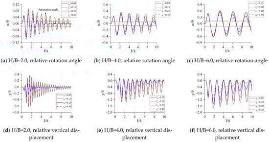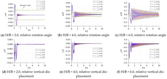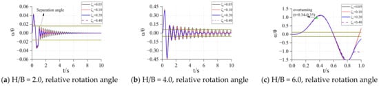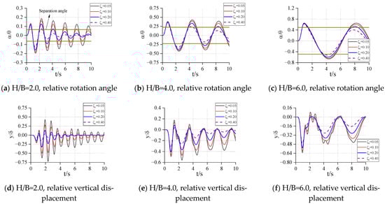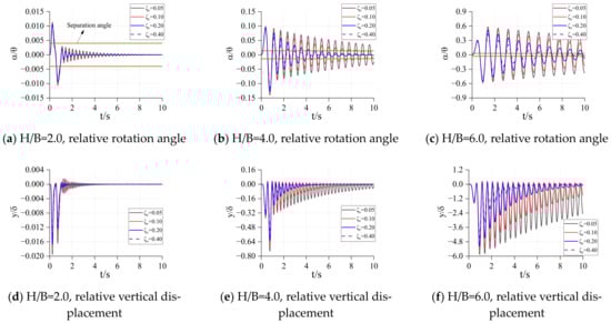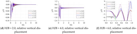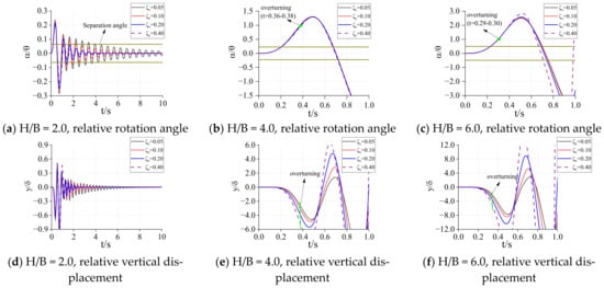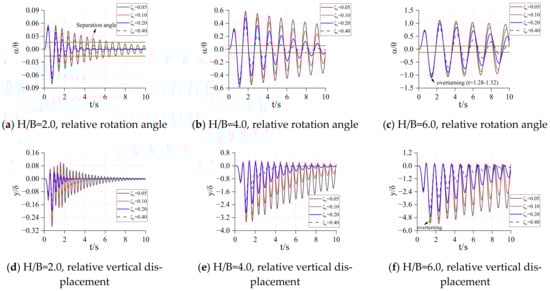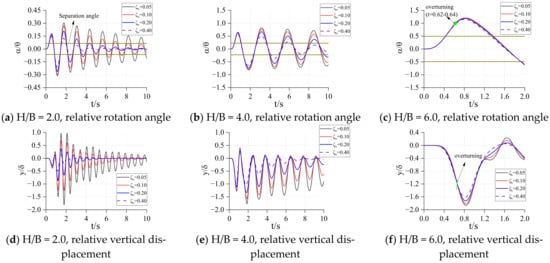 Figure 15, each figure is the response of the structure with different height–width ratios under a fixed rigid block size and spring stiffness. It can be found from these figures that when the size of the rigid block and the stiffness coefficient of the bottom spring are determined, its relative rotation response and relative vertical displacement response increase with the increase of the height–width ratio of the rigid block. When the size of the rigid block is big and the stiffness coefficient of the spring are small, the rigid block may overturn in a very short time under excitation. With the increase of the height–width ratio, the overturning time will be shorter and shorter, and the occurrence of this overturn does not change with the different damping of the structure. When the spring stiffness at the bottom of the structure is large, the overturning response may occur after the end of excitation (