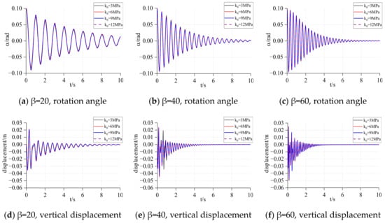 Suppose that the kinetic energy recovery coefficient of the rigid rocking block is always , the effects of different height width ratios (), different sizes (), different spring stiffness (), and different damping () on the response of the rigid block are analyzed. In order to facilitate the analysis, the clockwise rotation angle and vertical displacement of the two parameters of the response are normalized and divided by the overturning angle of the rigid block itself and the displacement generated under the self-weight condition, respectively.
