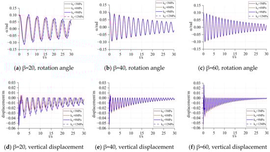 From the comparison between the figures, when the height–width ratio of the rigid block and the stiffness coefficient of the spring are determined, it takes longer for the structure to become stable under the damping effect, as the size of the structure increases. When the height–width ratio is small, the response of the relative rotation angle and vertical displacement of the rigid block decrease with the increase of the size of the rigid block. When the height–width ratio is large, the response of the structure increases first, and then decreases as the size of the structure increases. This shows that for a structure with a larger height–width ratio, increasing the structure size may increase the response. In general, as the size of the structure increases, the possibility of overturning decreases and the occurrence time becomes later.