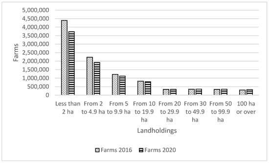 The higher standard output per hectare (Table 2) for larger farms is not only for the extra hectares they use, but for all hectares. Therefore, the statistical data suggest that in current farms, there is a large incentive towards scale enlargement. If, as Luijt and Voskuilen [36] have suggested for the Netherlands’ context, the idea is that these extra outputs can be unlocked by buying extra land, the result is that the extra output can be allocated to the extra land acquired to achieve higher production, especially for larger farms (Table 3 and Table 4). The results presented are only an assumption. It is about different farms that are in different size classes. Differences in context between the farms may dictate these differences. Therefore, it is a potential increase that may not reflect the situation of a specific farm. However, it is also a step that many farms take as they grow.