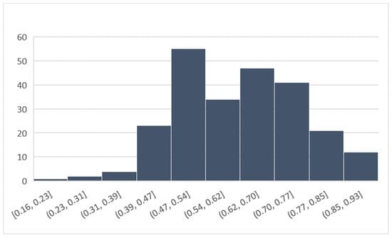 Number of EU27 NUTS2 regions by GINI index of land holdings in 2020 (this paper, based on [41]).