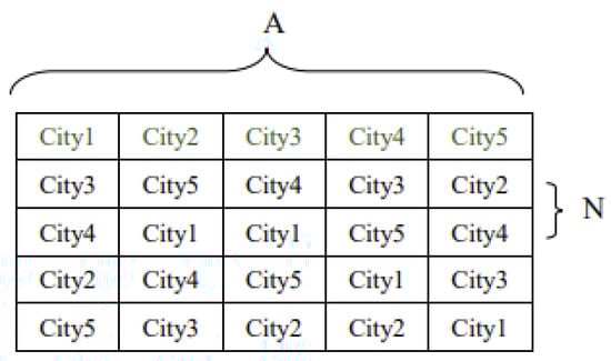 The format of TSP problems is a given set of nodes and the length of travel between pairs of nodes. The objective of TSP is to find the traversal of minimum length that visits each node exactly once and returns to the initial node []. The description of the traveling salesman program model is as follows: Assume that a traveling salesman must visit N cities, and the coordinates of each city are (,),(), with the Euclidean distance between city i and the city j as as Equation (1).