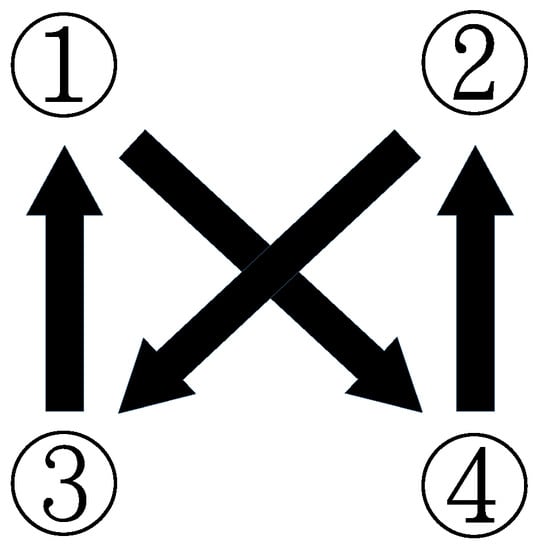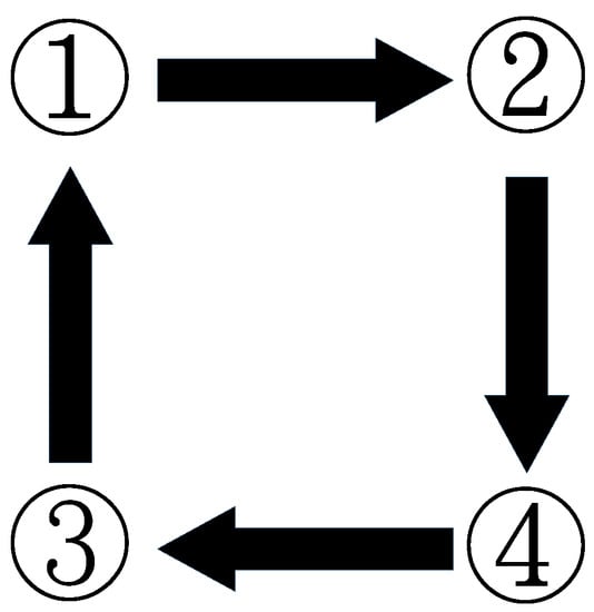 The 2-opt algorithm is a method for solving the TSP. The principle of 2-opt is to reroute the travel path to remove instances where it crosses over itself. The process of applying the 2-opt algorithm to TSP is as follows: Select two paths from all paths to delete. Change the next hop of one path to the initial node of the other path. Traverse that path in reserve and connect with the next hop of the original path. Then, recalculate the total traveled distance for the new circuit. If the newly generated combination has a shorter path, replace the old combination with a new combination. Otherwise, reject changes and retain the original combination. Taking Figure 3 and Figure 4 as an example, the original circuit is ① → ④ → ② → ③. When 2-Opt is launched, two paths (1,4), (2,3) are deleted. The initial node is selected from one of the deleted paths. In this case (1,4) is selected and this node’s next hop will be changed to node 2 and then continue the path by reversing the direction between node 2 and node 4. Then, the path will continue by connecting to the next hop of the other deleted path, thereby completing the circuit. As shown in Figure 4, the new circuit order is ① → ② → ③ → ④. The length of the new path is then recalculated. If it is shorter than the original circuit, the new path is adopted. Otherwise, the original circuit is retained.