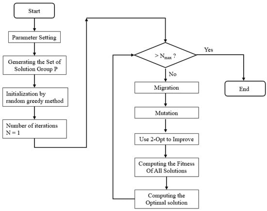 When the original biogeographic algorithm is used to solve the traveling salesman problem, it is possible to be trapped in a local optimal solution during later iterations. Therefore, two methods are applied to address this shortcoming in this work. The first is to use greedy-random initialization to obtain an initial travel solution that is closer to the optimal solution. After the migration and mutation of the reasoning algorithm, the 2-opt algorithm is used to improve the circuit path [], so as to obtain the best solution. Please refer to the flowchart of the improved method in Figure 5. In the Figure, P is the population size and is the maximum number of iterations.