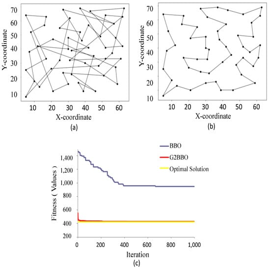Figure 6a,b illustrate the difference between BBO and G2BBO on the TSPLIB graph instance Eil51 which has 51 cities. In Figure 6c, the BBO algorithm has a clear approach to the optimal solution before 400 iterations. However, after that, it cannot break through the local optimal solution, resulting in slower convergence speed and stagnation. In contrast, the G2BBO algorithm quickly approached the global optimal solution before 10 iterations. G2BBO shows efficiency in solving the TSP path optimal solution.