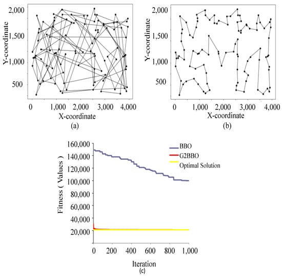 Figure 7a,b illustrate the difference between BBO and G2BBO on the TSPLIB graph instance Eil76 which has 76 cities. In Figure 7c, the BBO algorithm has a good convergence effect before 600 iterations, but after that, the convergence speed gets slower and slower, and it is unable to break through to the local optimal solution. On the other hand, G2BBO also has a good convergence effect before 10 iterations.