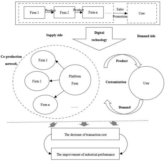 Secondly, digital technology promotes the industrial division of labor and production coordination in the manufacturing industry. Digital technology helps firms to outsource production so as to focus on their core business with comparative advantages; it also helps to reduce manufacturing costs [46] and promote the expansion and deepening of the division of labor [47]. In addition, digital technology enables firms to form networked collaborations. The production links of the traditional manufacturing industry are complex-serial-link-based, with links separated from each other and often adopting different technical standards, such that it is difficult for them to interact with each other. With the popularization of the industrial Internet, networked collaborative manufacturing makes it possible for different market actors to collaborate closely [48]; transforms serial work into parallel work, forming a manufacturing network; and realizes the large-scale integration and optimization of production factors and resources.