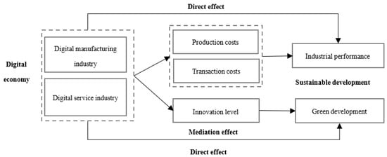 Several studies have discussed the socio-economic impact of the digital economy. The existing research mainly focuses on the following three aspects. First, on the macro level, the digital economy facilitates technological innovation [6,7] and high-quality economic development featuring green development, innovative development, and coordinated development by optimizing resource allocation [8]. In addition, the digital economy significantly promotes the upgrading of the technological progress and human capital of Chinese cities, thus promoting the upgrading of the industrial structure. The digital economy can also have an indirect impact on the upgrading of industrial structures by affecting the innovation level of the region [9,10,11]. Heterogeneity analysis reveals that digital finance plays a more significant role in cities with developed economies, low levels of financialization, and small urban–rural income gaps [12]. Second, on the meso level, the digital economy has an impact on the development of the manufacturing industry. Big data [13] and other digital technologies can promote the digital transformation of the manufacturing industry [2] and improve its total factor productivity [14] by reshaping the production function of firms [15] and enhancing the innovation of firms [16,17]. Third, on the micro level, the digital economy can improve the total factor productivity of manufacturers and thus their performance by improving the innovation capability of the firms [18], optimizing the production process [19], and reducing the cost of information interaction [20]. To sum up, there is extensive research on the impact of the digital economy at the macro level and the enterprise level, which provides a theoretical basis and empirical support for this study. However, there are few studies that examine the role of the digital economy at the industrial level, and no research has used empirical analysis to respond to the relationship between the digital economy and the sustainable development of manufacturing.