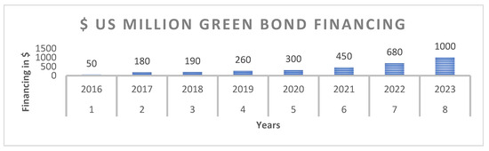 The Economic Forum of Green Horizon Summit (EFGHS) on 11 November 2020 was globally inclined to protect the environment from natural disasters and direct banks and investors to invest in green financing projects and to provide operational loans for greening projects. According to the Intergovernmental Panel on Climate Change’s (IPCC) 2018 reports [10], the adaptation and mitigation of abrupt changes in climatic conditions are dealt with by climatic finance as sustainable finance controls social, environmental, and governance-related projects. On the other hand, green financing covers all areas, including climatic finance and sustainable finance, with the addition of environmental goals [8]. The central banks of all the developed countries are considering financing their green projects through green investments such as the floatation of green bonds [11,12]. The very first green bond was floated in financial markets by the joint mutual partnership of the European Investment Bank (EIB) and the World Bank (WB). It was rated at AAA by Moody’s, AAA by the S&P, and AAA by Fitch, which ranks it as “Prime.” These bonds were legally floated on the capital markets in November 2008, and its market reached the tremendous figure of USD 1.2 Trillion by the end of 2008. The market of green investment bonds soon reached USD 2.8 trillion by 2020 [13]. The capital raised through these types of green bonds was given to member countries for green financing projects, including climatic and sustainable development efforts. Green loans are another type of green financing that is provided to SMEs [14].
